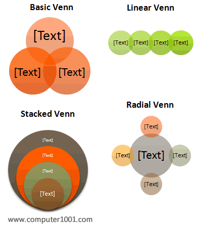 Di galeri pilih grafik smartart, klik hubungan, klik tata letak diagram venn (seperti venn dasar), lalu .