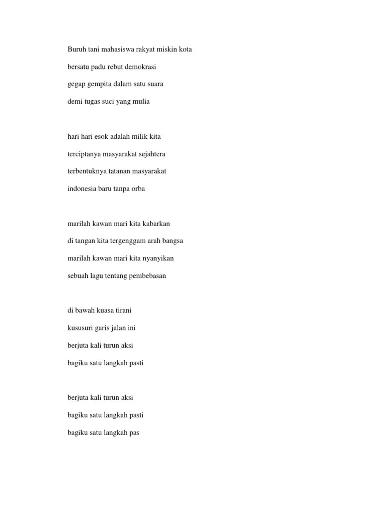 Lirik lagu hari hari esok adalah milik kita buruh, tani, mahasiwa, rakyat miskin kota bersatu padu tuntut perubahan bersatu tekad dalam satu suara demi .